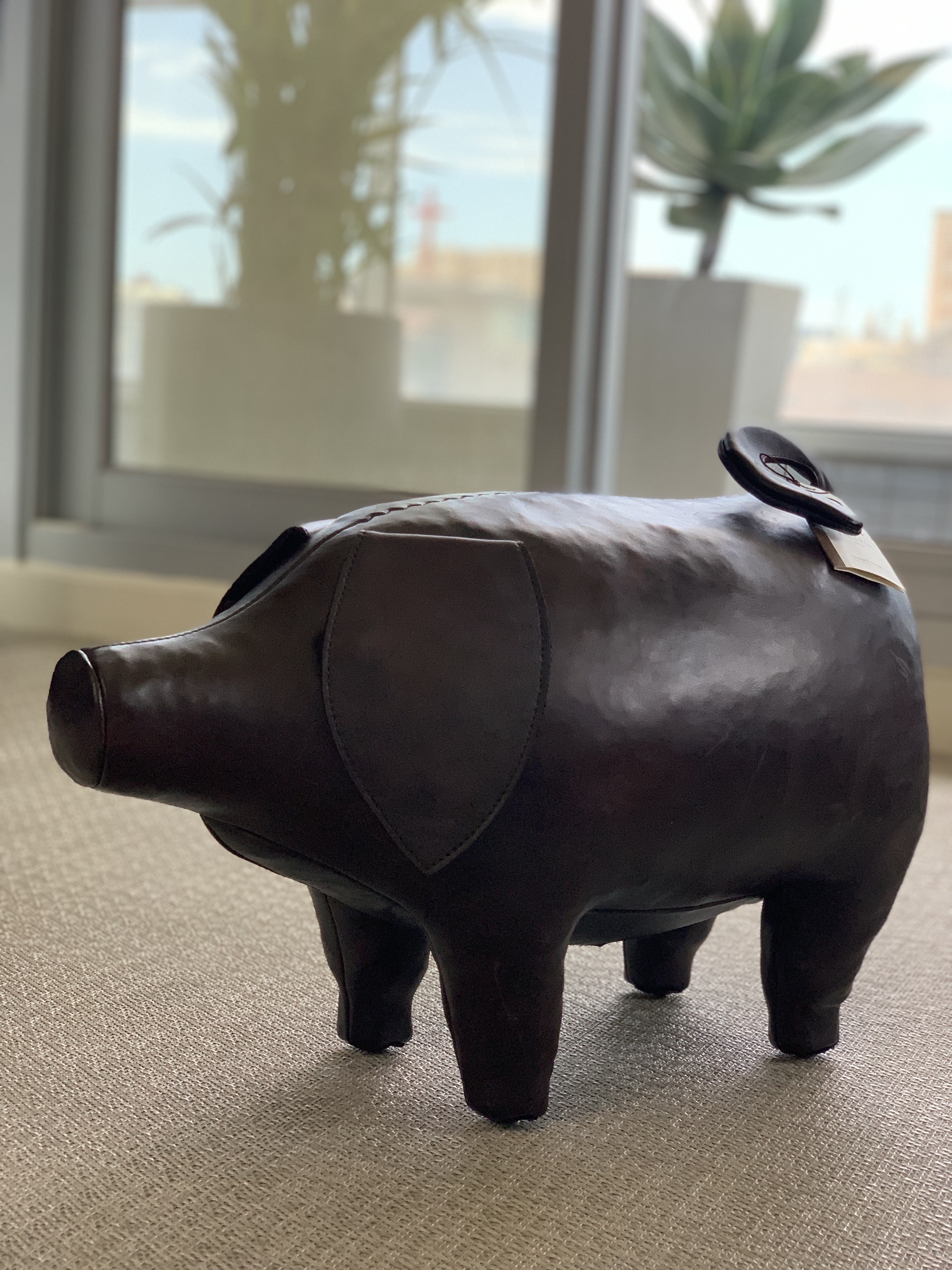 這隻皮革豬,是我們開幕時收到的禮物——Omersa 經典作品 Leather Yorkshire Pig,手工製作,質感溫潤厚實。牠不華麗,卻沉穩,一直靜靜陪著我們的團隊。有一天你來事務所時,也許會看到牠站在角落。