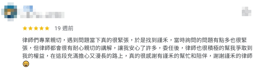 2.律師們專業親切,遇到問題當下真的很緊張,於是找到謹禾,當時詢問的問題有點多也很緊張,但律師都會很有耐心親切的講解,讓我安心了許多,委任後,律師也很積極的幫我爭取到我的權益,在這段充滿擔心又漫長的路上,真的很感謝有謹禾的幫忙和陪伴,謝謝謹禾的律師😀