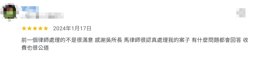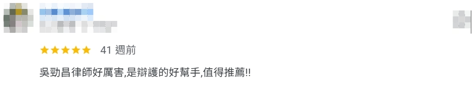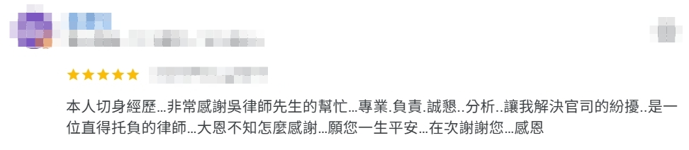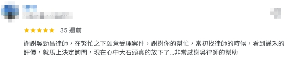6.謝謝吳勁昌律師,在繁忙之下願意受理案件,謝謝你的幫忙,當初找律師的時候,看到謹禾的評價,就馬上決定詢問,現在心中大石頭真的放下了…非常感謝吳律師的幫助
