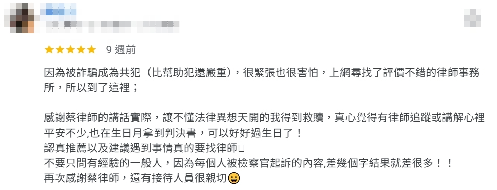 11. 因為被詐騙成為共犯(比幫助犯還嚴重),很緊張也很害怕,上網尋找了評價不錯的律師事務所,所以到了這裡;