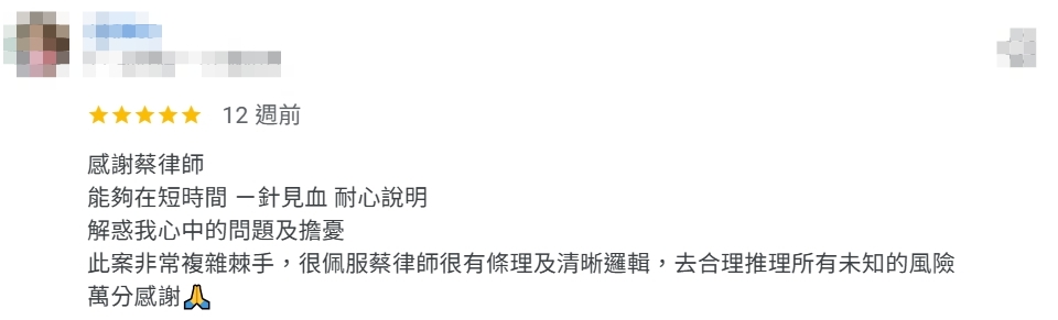 但真的非常推薦可以放心的把自己的案件交給蔡律師,因為蔡律師的用心分析及判斷,讓整件事情的脈絡與走向都在蔡律師的掌握之中,有了蔡律師,所以我們有好的勝利!🙏