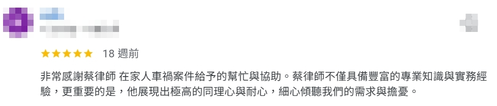 13.非常感謝蔡律師 在家人車禍案件給予的幫忙與協助。蔡律師不僅具備豐富的專業知識與實務經驗,更重要的是,他展現出極高的同理心與耐心,細心傾聽我們的需求與擔憂。