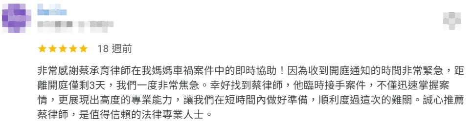 14.非常感謝蔡承育律師在我媽媽車禍案件中的即時協助!因為收到開庭通知的時間非常緊急,距離開庭僅剩3天,我們一度非常焦急。幸好找到蔡律師,他臨時接手案件,不僅迅速掌握案情,更展現出高度的專業能力,讓我們在短時間內做好準備,順利度過這次的難關。誠心推薦蔡律師,是值得信賴的法律專業人士。