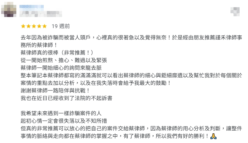 15.去年因為被詐騙而被當人頭戶,心裡真的很著急以及覺得無奈!於是經由朋友推薦謹禾律師事務所的蔡律師!