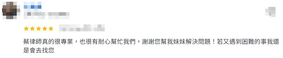 18.蔡律師真的很專業,也很有耐心幫忙我們,謝謝您幫我妹妹解決問題!若又遇到困難的事我還是會去找您