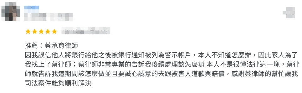 因我誤信他人將銀行給他之後被銀行通知被列為警示帳戶,本人不知道怎麼辦,因此家人為了我找上了蔡律師;蔡律師非常專業的告訴我後續處理該怎麼辦 本人不是很懂法律這一塊,蔡律師就告訴我這期間該怎麼做並且要誠心誠意的去跟被害人道歉與賠償,感謝蔡律師的幫忙讓我司法案件能夠順利解決