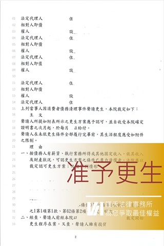 當事人前因積欠銀行債務高達665餘萬,不堪負擔,委託本所協助債務協商及更生,經臺灣橋頭地方法院裁定准予更生,分期6年,總計金額僅需清償18餘萬元,減掉約647餘萬債務。