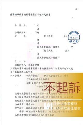 當事人為整形外科醫師,為某患者施行手術後,該名患者因身體不適而提告當事人過失傷害,經律師積極協助後,順利取得不起訴處分。▌順利爭取不起訴處分