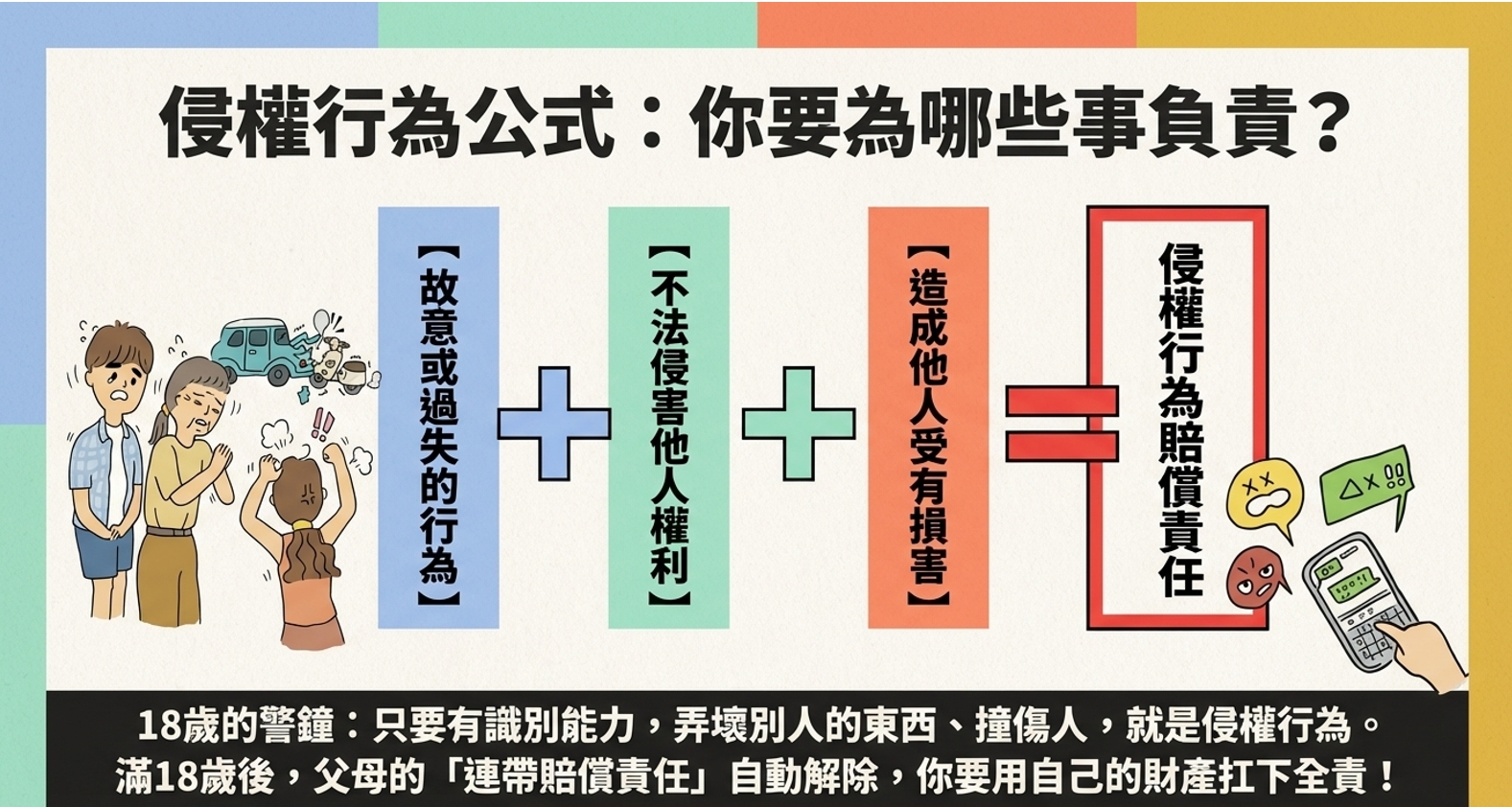 - 爸媽解脫了: 18 歲後,你的侵權行為,爸媽在法律上沒有連帶賠償的義務了。