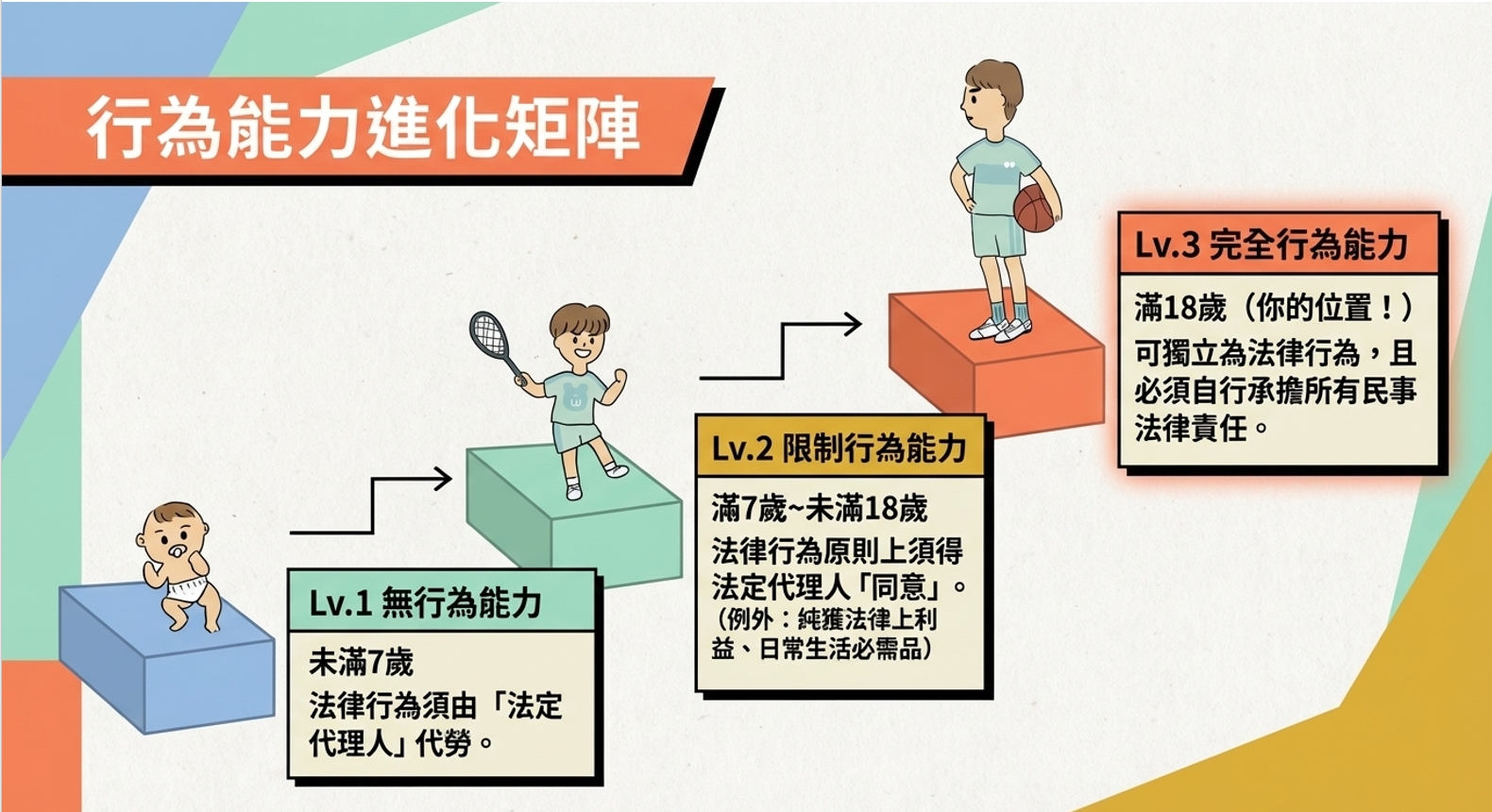 - 7 到 18 歲: 限制行為能力。買午餐、買文具OK,但買昂貴的限量球鞋就要爸媽點頭。