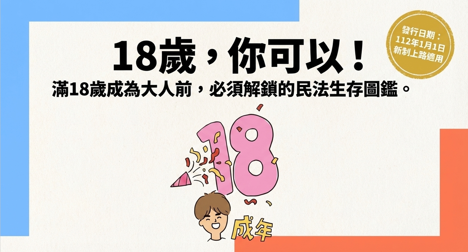 自從 112 年元旦起,民法成年年齡下修到 18 歲。這代表你現在可以獨自去辦信用卡、去銀行開戶,甚至是想在學校附近租個小窩,都不再需要爸媽在契約書上簽名蓋章了。
