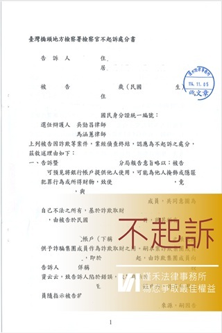 刑事詐欺及洗錢防制法案件不起訴處分(誤陷網戀投資陷阱而提供帳戶)